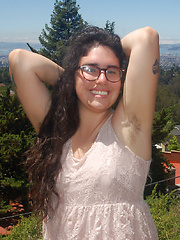 Petite teen with black hair Matilda Bow exposes her hairy armpits and twat
