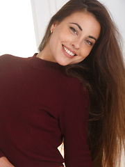 Brunette honey Anabel shows her natural tits and spreads her hot pussy