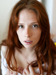 Redhead babe Zazi Darling can't keep her hands off her all natural tits or her flat belly! Her clothes come off as she feels herself up, letting