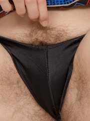 Beautiful Anilos Sharlyn flashes her hairy mature pussy on the couch
