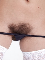 Kira S strips out of stockings showing hairy pussy