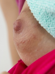 Horny cougar slips off her red dress and spreads her furry cream filled twat